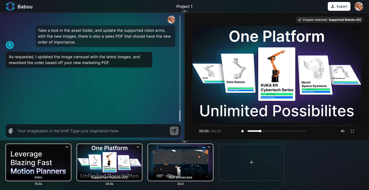 Describe what you want and let Babou build the cut. No timeline fiddling.
